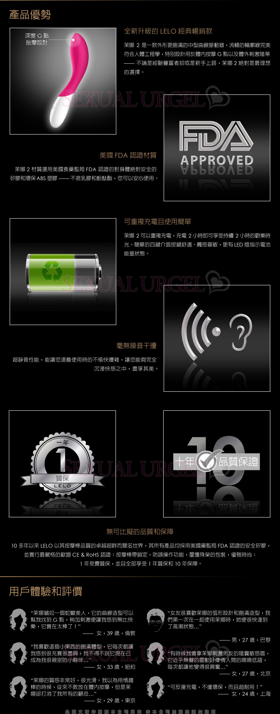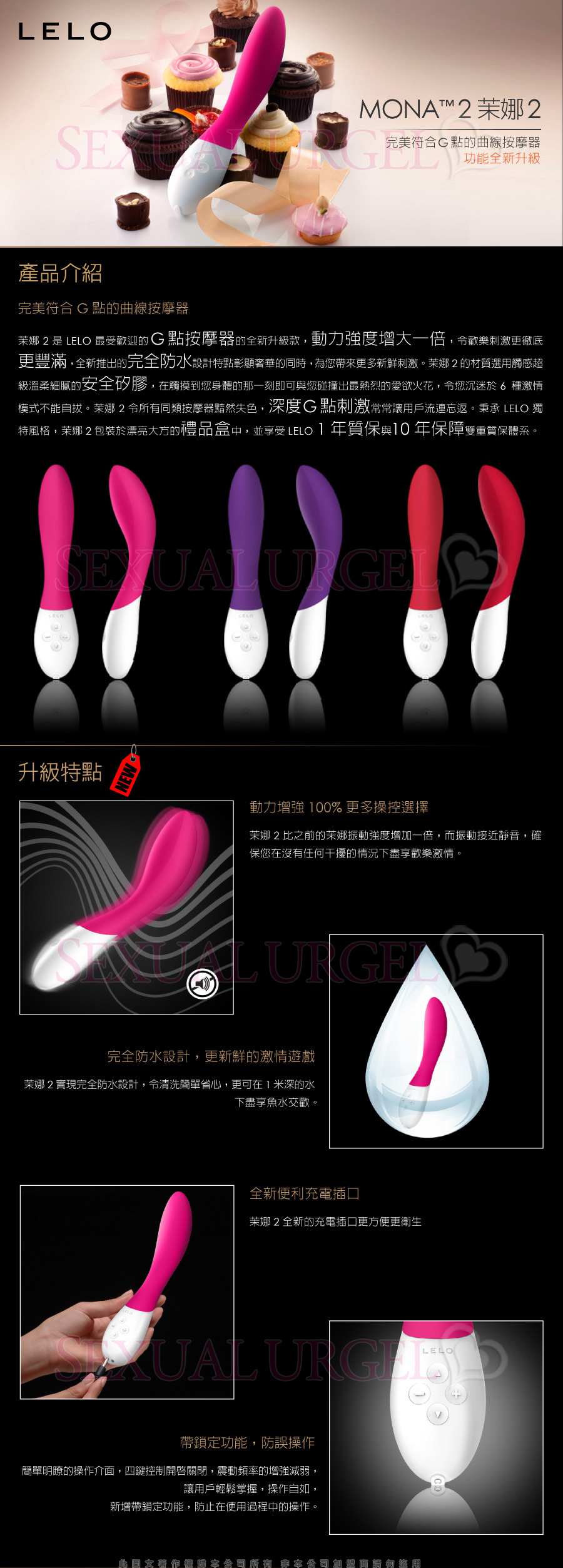 夢娜TM2(MONA 2)是LELO最受歡迎的G點按摩器的全新升級款,動力強度增大一倍,令歡樂刺激更徹底更豐滿,全新推出的完全防水設計特點彰顯奢華的同時,為您帶來更多新鮮刺激。夢娜2(MONA 2)的材質選用觸感超級溫柔細膩的安全矽膠,在觸摸到您身體的那一刻即可與您碰撞出最熱烈的愛慾火花,令您沉迷於6種激情模式不能自拔。夢娜2(MONA 2)令所有同類按摩器黯然失色,深度G點刺激常常讓用戶流連忘返。秉承LELO獨特風格,夢娜2(MONA 2)包裝於漂亮大方的禮品盒中,並享受LELO 1年質保與10年保障雙重質保體系。