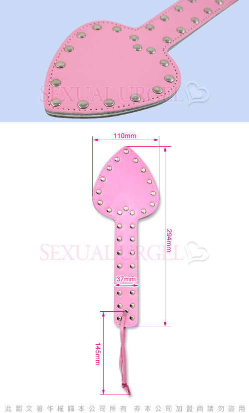 粉色全皮。雙層設計,拍體柔韌強硬,容易控制力度,金屬鉚釘強調硬度與威嚴,隨心所欲在她/他身上留下愛的痕跡。在你的揮舞拍打下,愛侶的身體立刻出現性感的潮紅。在大片大片的紅腫下,她/他的呻吟痛苦中更帶著快意。不知真正享受的是奴隸主的心神還是奴隸的身體