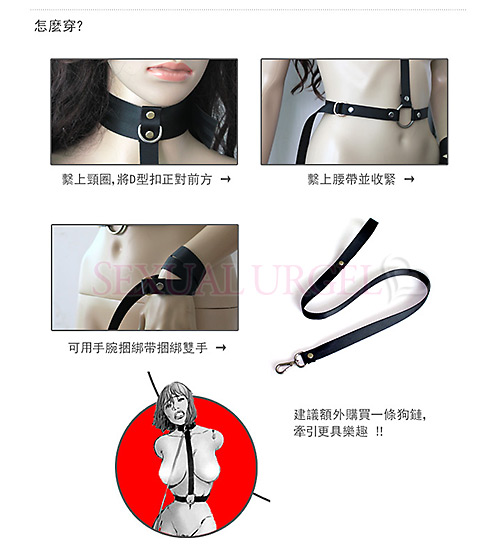 上體的捆縛充滿樂趣,方法也非常之多。這個款式將 雙手反綁在背後,利用狗鏈牽引(狗鏈須額外購買)。 整體效果不錯!牽著她,完全是專屬品的感覺。