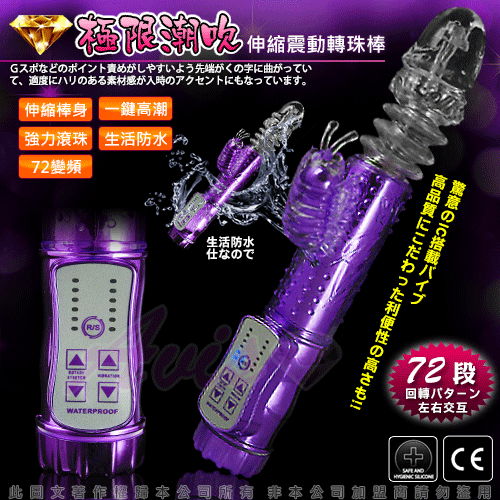 最新強力電動伸縮按摩棒,可同時震動陰道、陰核,震動力強勁!耐用、耐操,同時可震動,遠遠超越了男性陽具所能發揮的體能極限,強烈的戳幹力,幾乎讓人無法一手掌握,再怎麼強烈的燎原慾火,也會被它所撲滅夷平。中間的環紋部分不停地伸縮、抽動,在您的私處進出、摩擦;小蝴蝶的拍打、添吸著您最敏感的陰蒂……