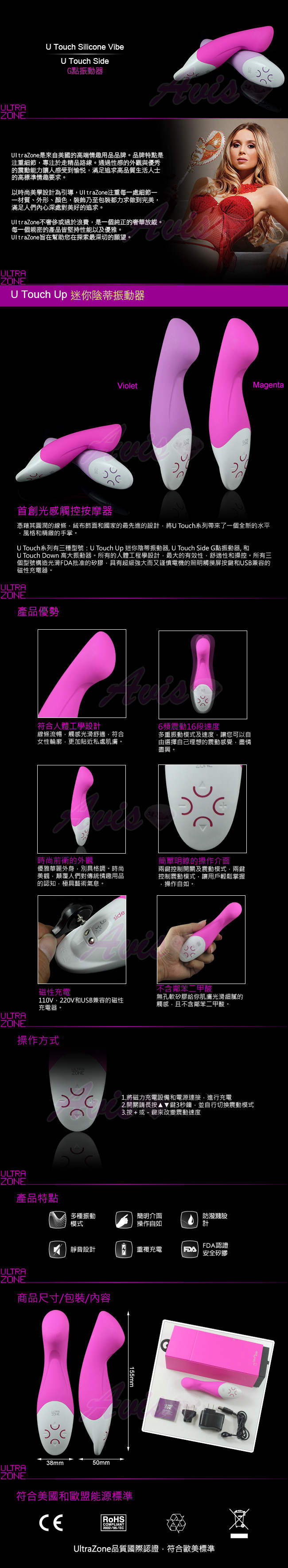 .主商品:美國Ultrazone-U-Touch Side 光學觸控按鍵 磁吸式充電 6段變頻防水G點挑逗棒-紫 *1