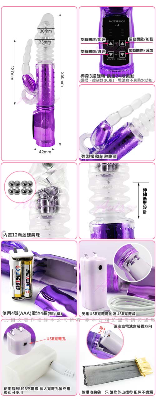 .商品名稱:獨角仙神話-72段 電池/USB 電鍍款(伸縮式)變頻滾珠G點按摩棒-紫*1