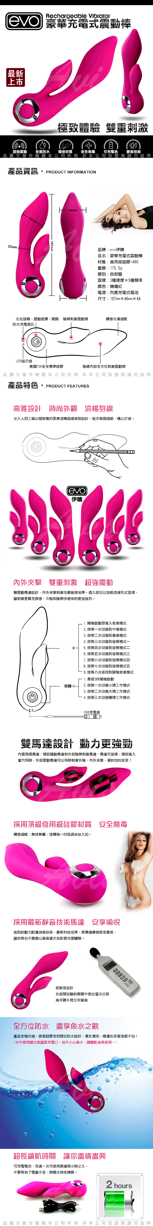雙震動馬達,頭部的震動加上不斷拍打著陰蒂的刺激,內外夾擊最敏感的地帶,插入部位以加粗流線型式呈現,讓刺激更具充實感,拍打加上震動快感來的更強烈