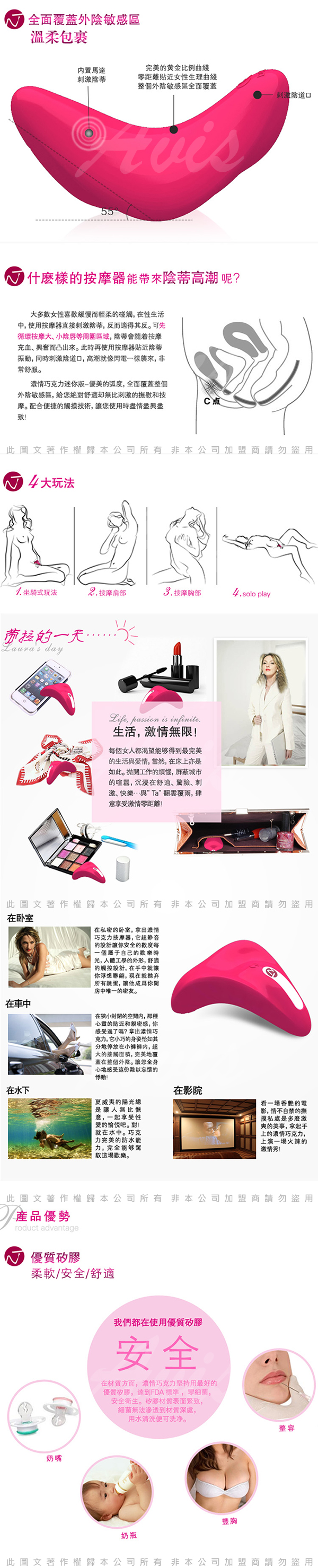 最新出品的專為愉悅女性而開發的流線型按摩震動器。其外形設計完全符合人體工程學原理,首創的觸摸式滑動條輕鬆操控震動強度,