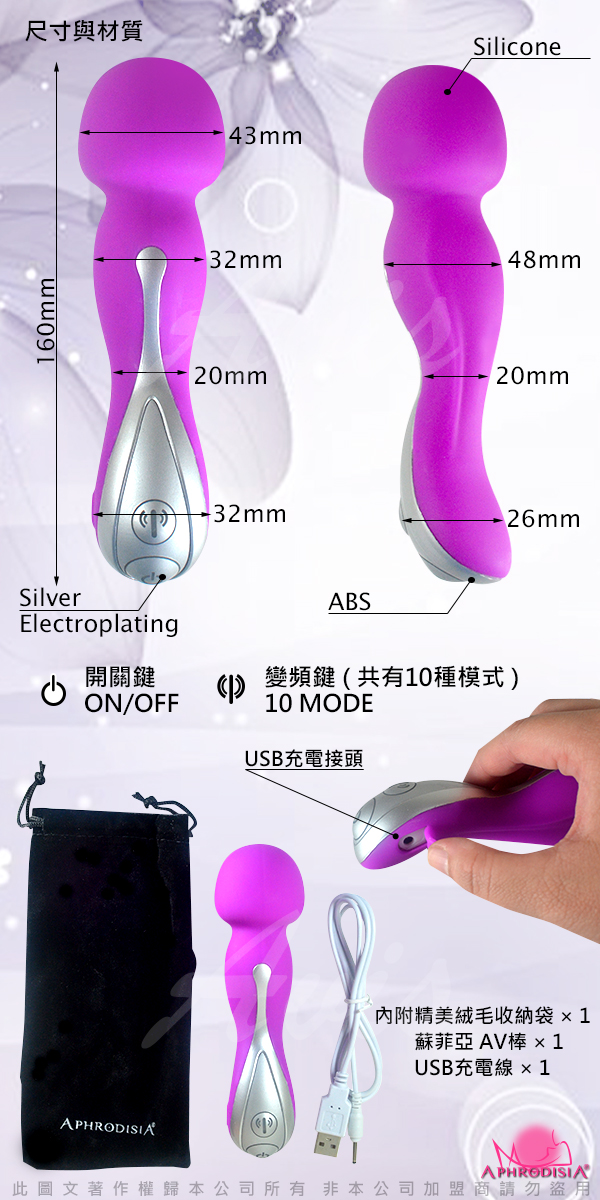 .商品名稱:APHRODISIA SOPHIA 索菲亞 10段變頻 全矽膠防水AV女優按摩棒 紫紅 USB充電(S)