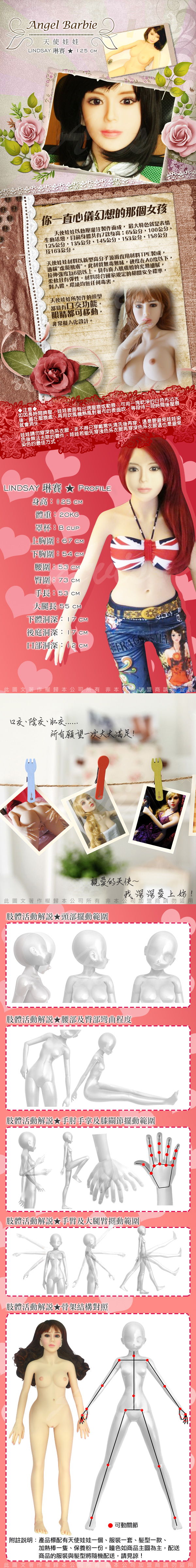 .商品內容:現貨供應 天使娃娃 真人矽膠娃娃 1:1非充氣  帶骨骼真人版 陰交+肛交+口交 LINDSAY琳賽-125CM