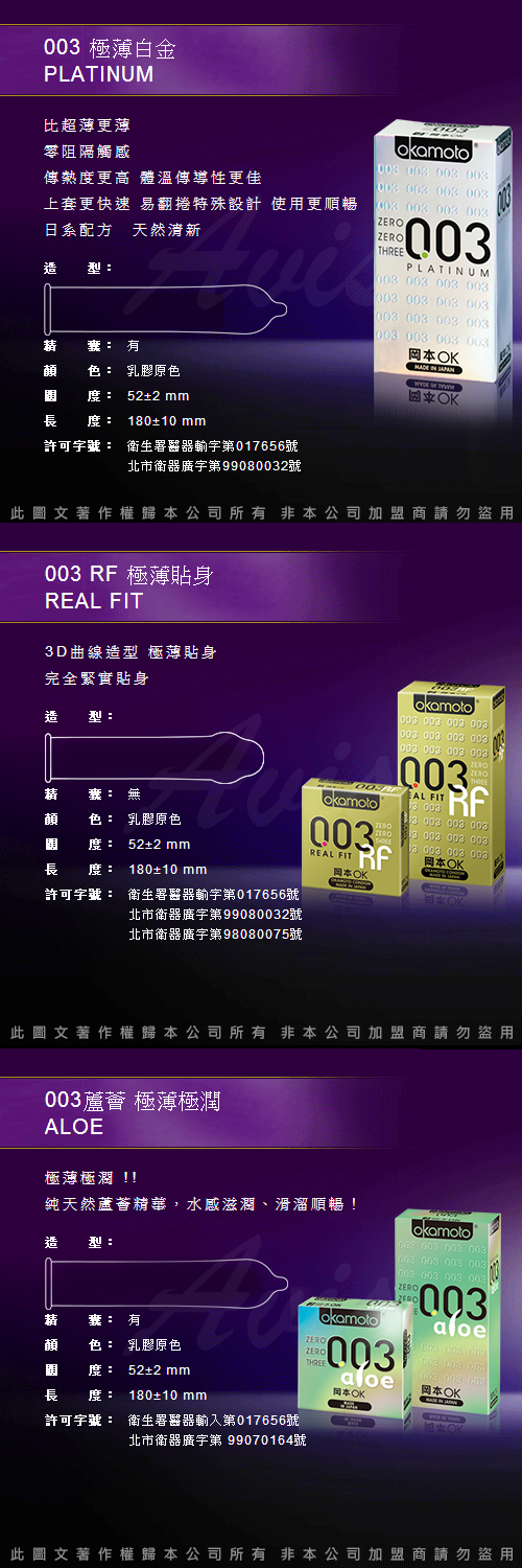 品名3:岡本003-ALOE 超潤蘆薈極薄保險套(6入裝)
