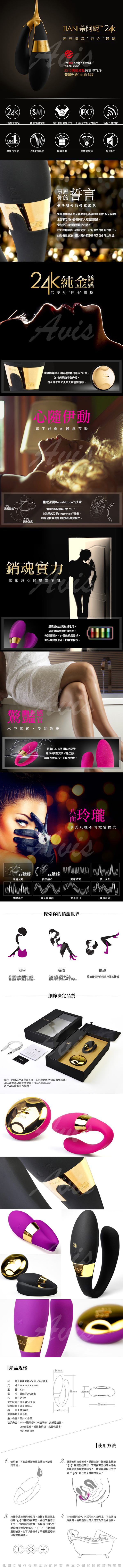 蒂阿妮24k具有24k鍍金環,上有激光雕刻的產品獨有序列號,新增雙重馬達令按摩更強勁,讓愛愛與眾不同、美妙難忘、奢華極致。愛愛時由女性佩戴,強勁振動可以遠​​程控制,也可運用LELO獨家的體感互動技術,增強雙方的愉悅感受。精緻小巧的光滑矽膠造型為她提供更充實的體驗,讓他感覺更強烈,蒂阿妮24k靈活有彈力,滿足您的所有體位。