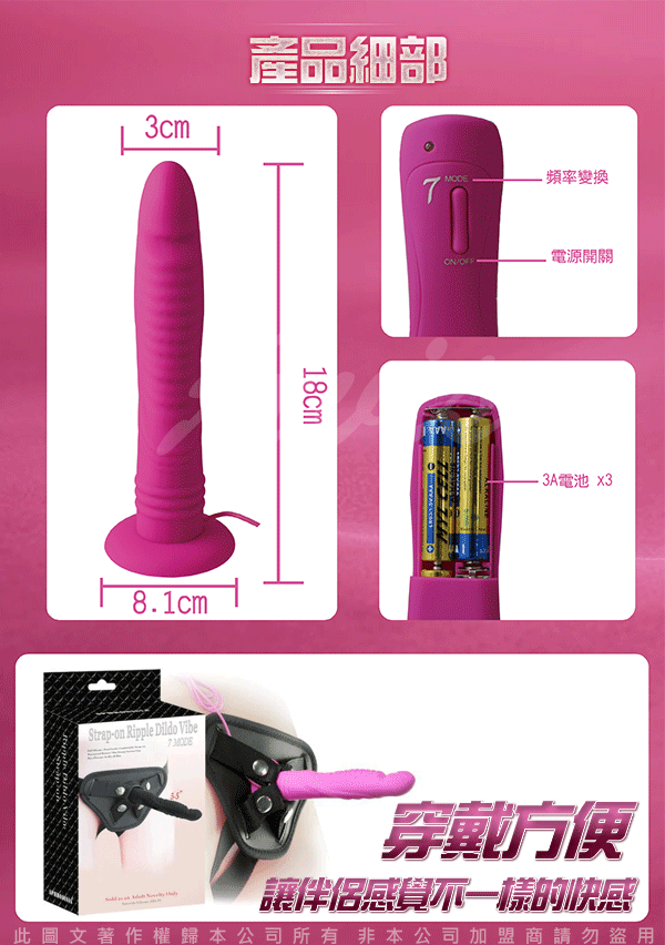 按摩棒內有震動馬達,共有七段變頻可供你選擇震動強度,在抽插的同時,開啟震動鍵,一浪又一浪的舒麻感襲捲你的伴侶,讓她欲罷不能