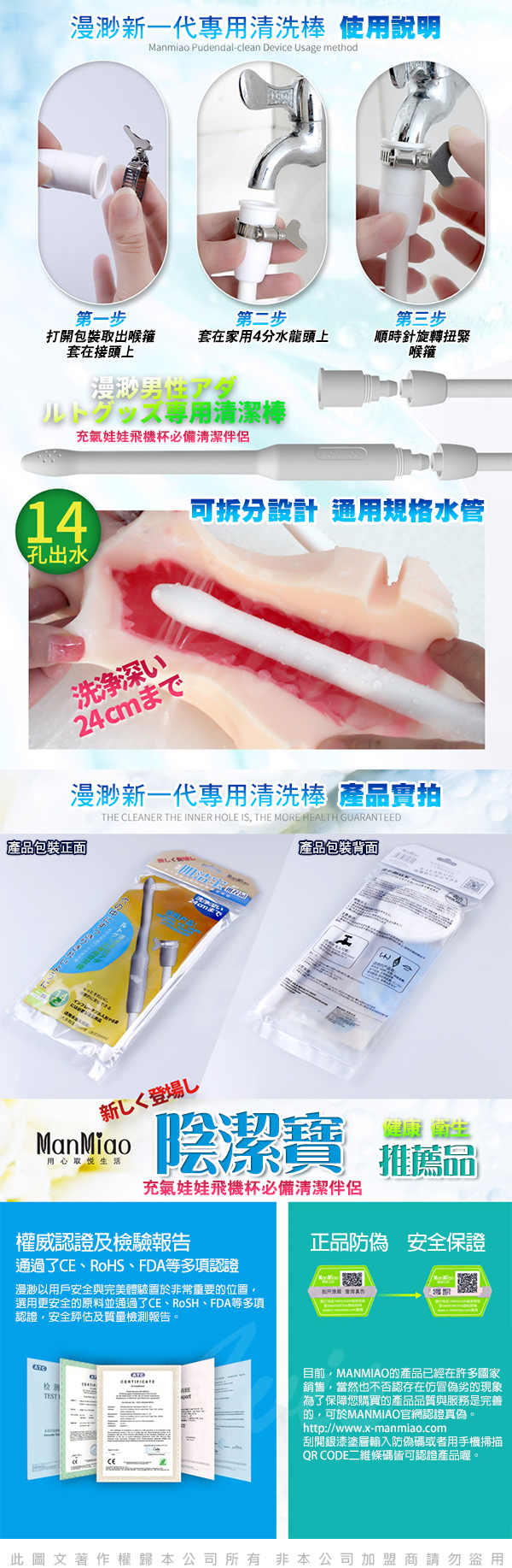 經漫渺多年用戶反饋,大多數男性用對情趣用品(包括飛機杯、名器、倒模美臀、充氣娃娃等)產品在使用後清潔時,都產生不同程度的困擾,為此漫渺國際團隊特製開發此款專為男性情趣用品清潔使用的潔陰棒。