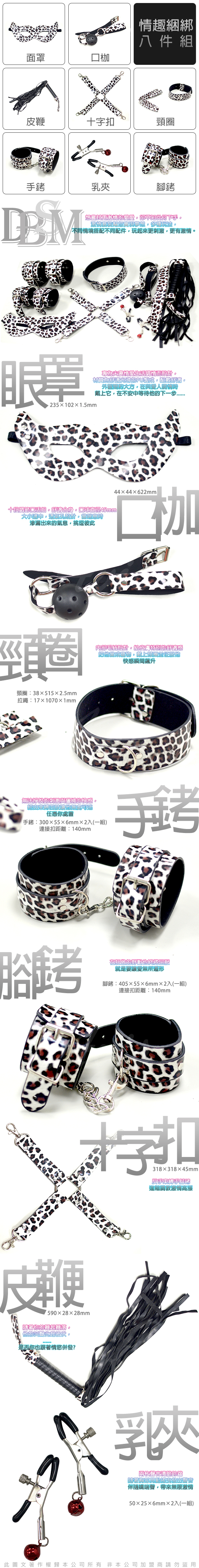 .商品內容:虐戀精品CICILY SM帝國 面罩/口塞/皮鞭/十字扣/手銬/乳夾/頸圈/腳銬 八件組 豹紋款