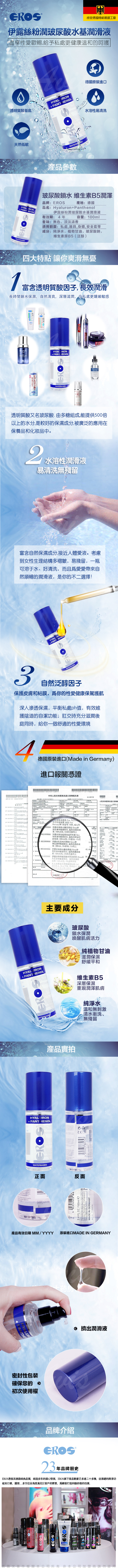 .商品內容:德國Eros HYALURON+PANTHENOL 水基玻尿酸潤滑液 100ml