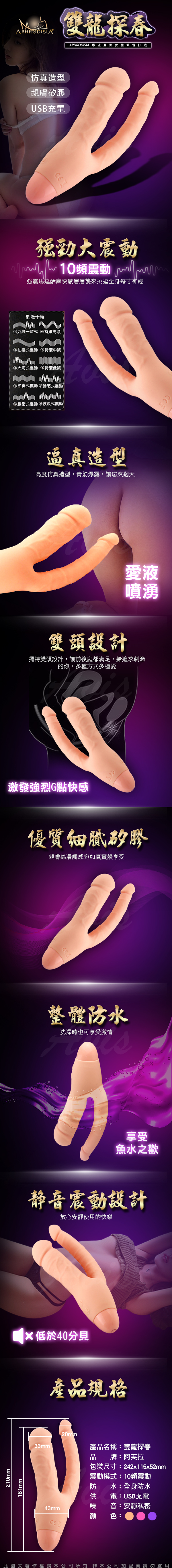 雙龍探春給您最震撼的感受,厭倦只能插一個穴的性愛嗎?想體驗前後庭都被充滿的愛愛模式嗎?雙龍探春讓您無法抵抗內心最深的欲望!逼真的老二造型筋脈暴露給您最真實的感受。獨特的雙頭設計讓追求刺激的您前後都滿足。完美親膚的造型設計輕鬆刺激陰道內部的每一個角落給您最真實的感受,引爆內心深處欲望。一棒在手,高潮無憂~擁有10段變頻強力震動帶給您陣陣舒爽,讓它做您最親密的愛人。每一處細節都是想讓您爽!另外擁有一鍵爆發瞬間超頻,激發身體中最深處的高潮。採用整體防水讓您洗澡時也能盡情享受激情喔~