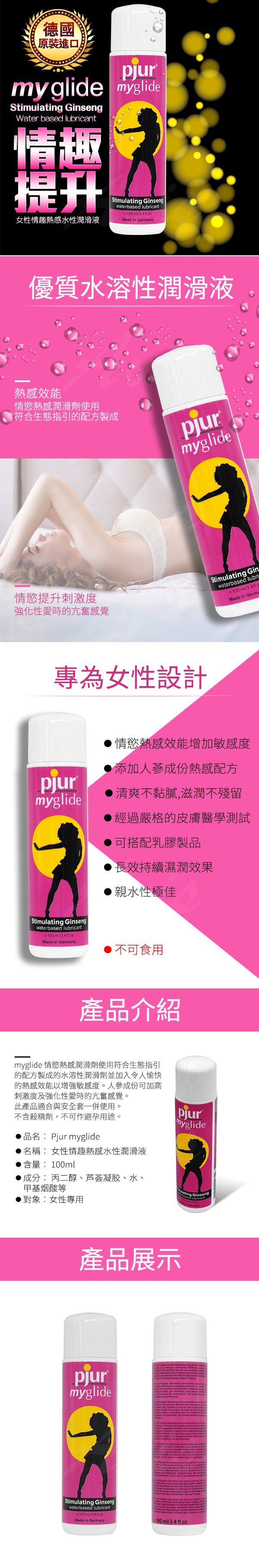 .商品名稱:德國Pjur Myglide女用熱感潤滑液 100ml