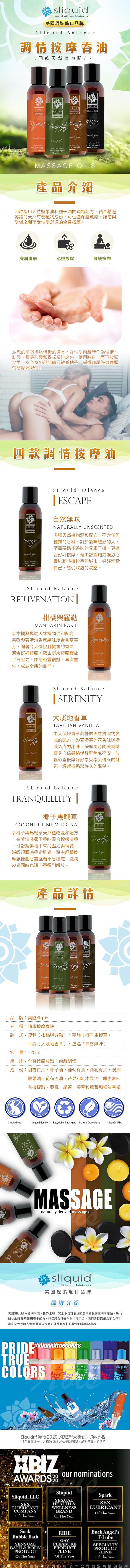 .商品名稱:美國Sliquid-Escape 逃逸 天然植物萃取 調情按摩油 125ml-自然無味