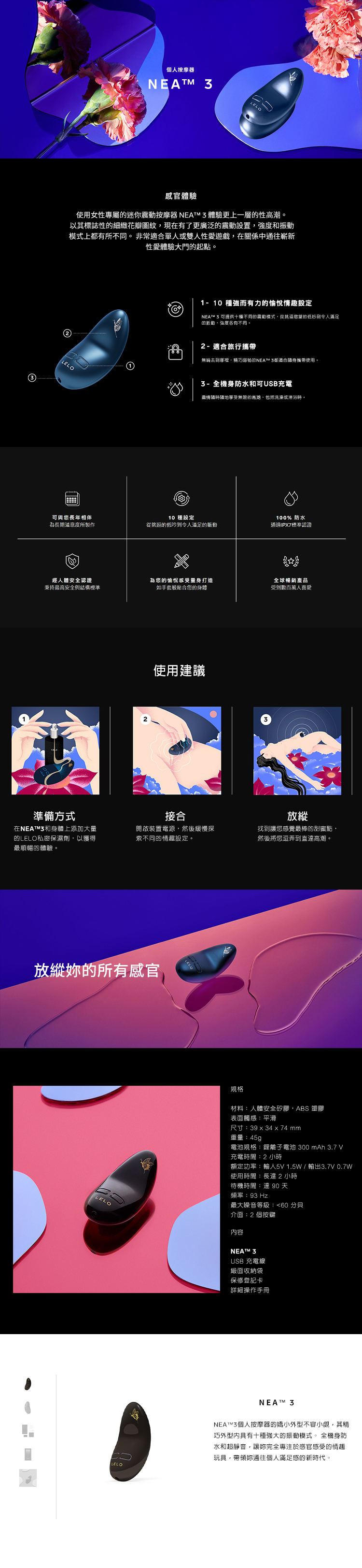 NEA™3個人按摩器的嬌小外型不容小覷,其精巧外型內具有十種強大的振動模式。 全機身防水和超靜音,讓妳完全專注於感官感受的情趣玩具,帶領妳通往個人滿足感的新時代。