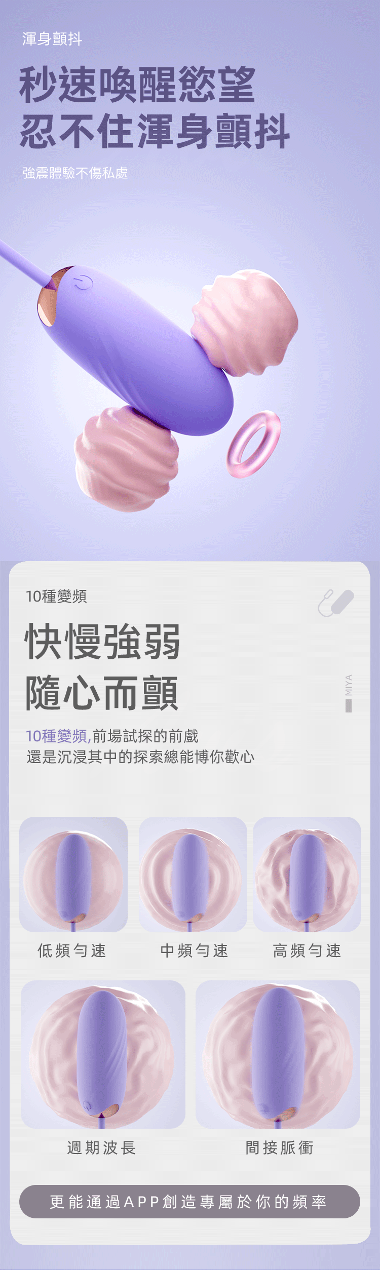 覓雅二代全新升級,Q彈矽膠,觸感絲滑柔軟,不傷私處更安心;小巧飽滿,充實卻不撐大,為亞洲女性量身定制,仿真紋路盡顯歡愉;APP操控,無線遙控給她驚喜, 異地控制零距離,渾身顫抖秒速喚醒慾望,忍不住渾身顫抖,強震體驗不傷私處,10段變頻,快慢強弱隨心而顫,前場試探的前戲,還是沈浸其中的探索總能博你歡心!
