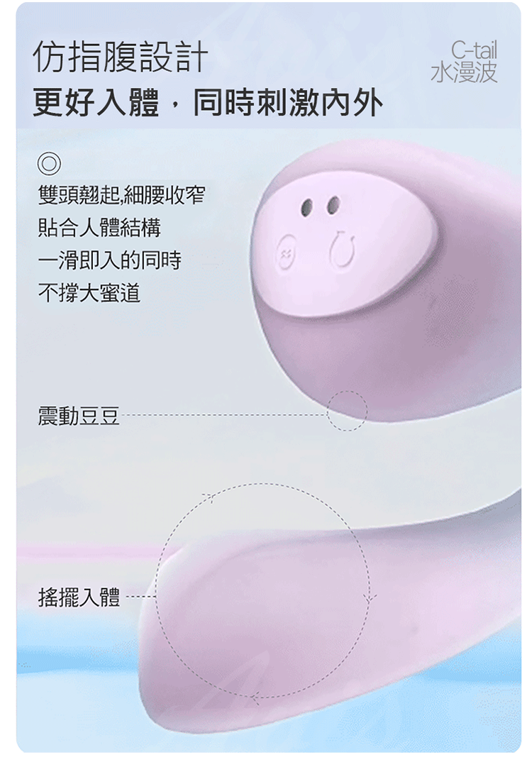 仿指腹設計,更好入體,同時刺激內外。雙頭翹起,細腰收窄,貼合人體結構。水漫波震動豆豆,搖擺入體。