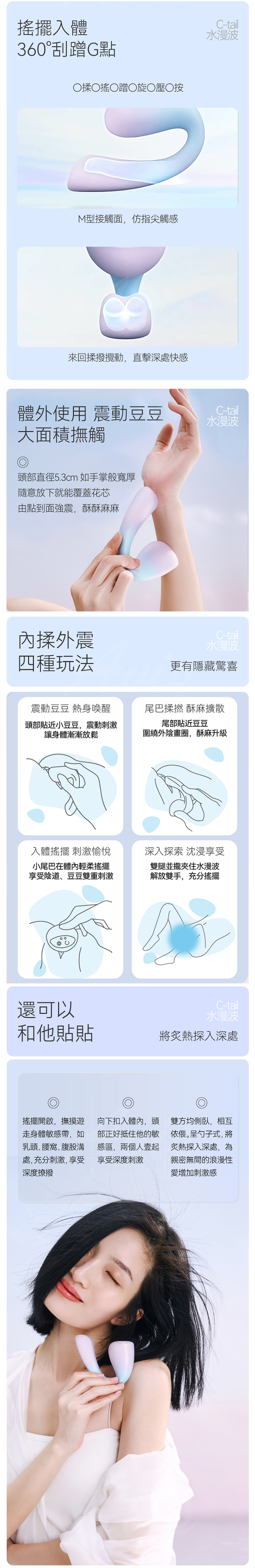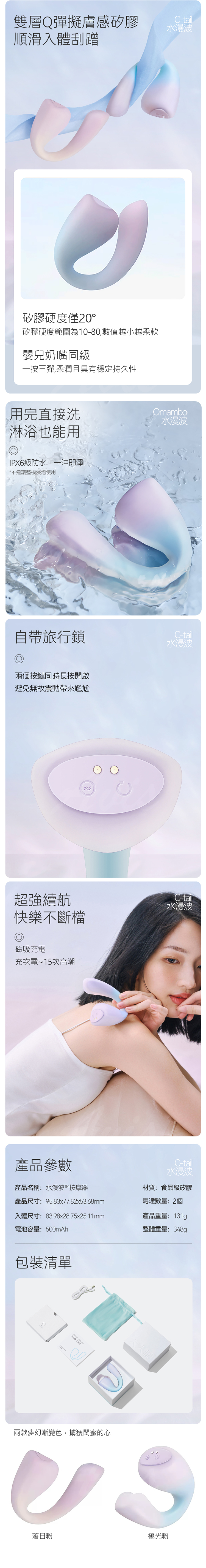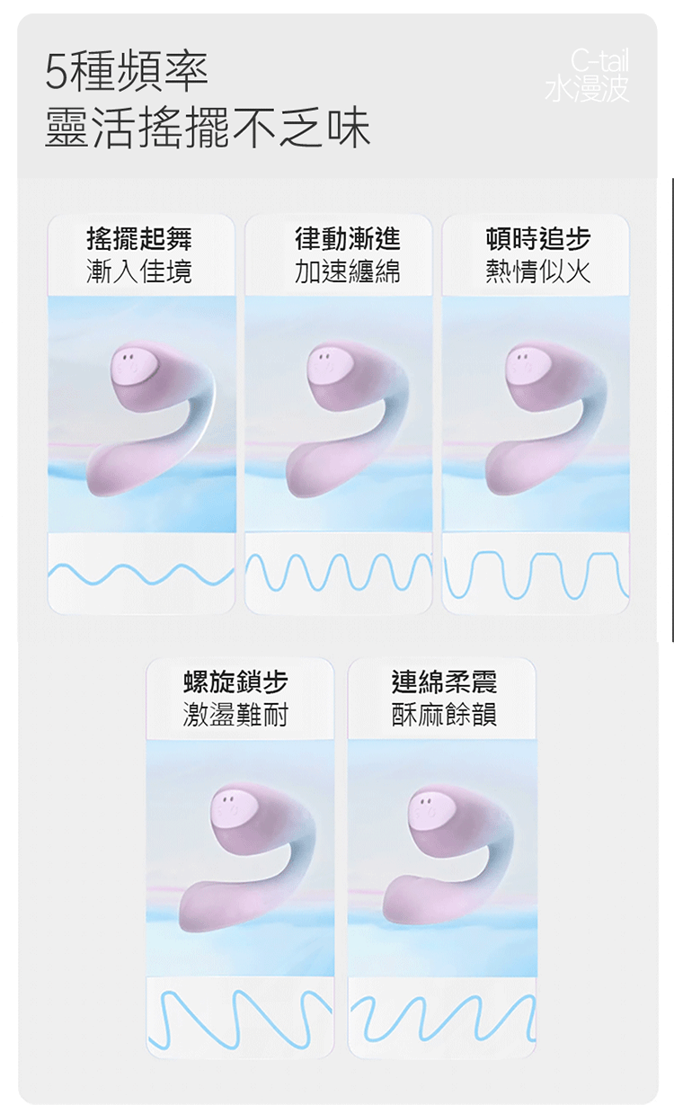 體外震動,刺激C點;搖擺入體,按摩G點;旋轉尾翼,勾挑揉撥。多檔震頻,帶來豐富體驗。小巧可愛,漸變夢幻色。靜音防水,旅行安全鎖。