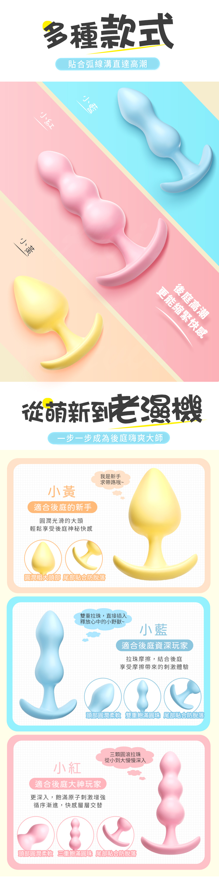 3種款式的高潮體驗套裝。其設計貼合身體曲線,溝紋直達高潮,讓您在享受後庭的刺激時,更能體驗到獨特的快感。