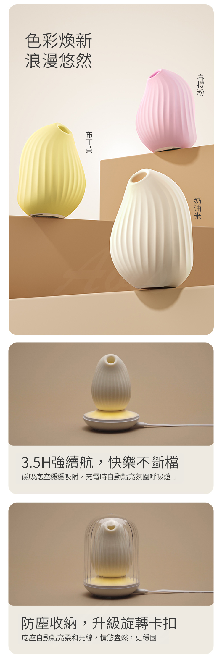 - 夜燈功能:底座自動點亮柔和燈光,不僅實用,更增添情調氛圍。