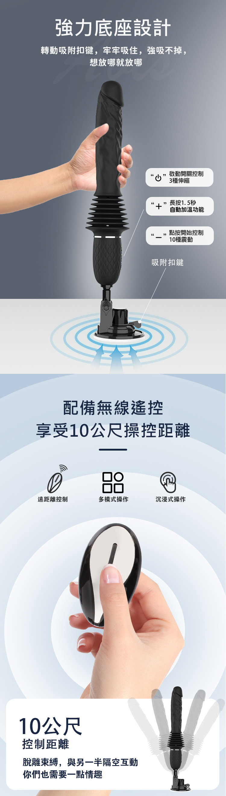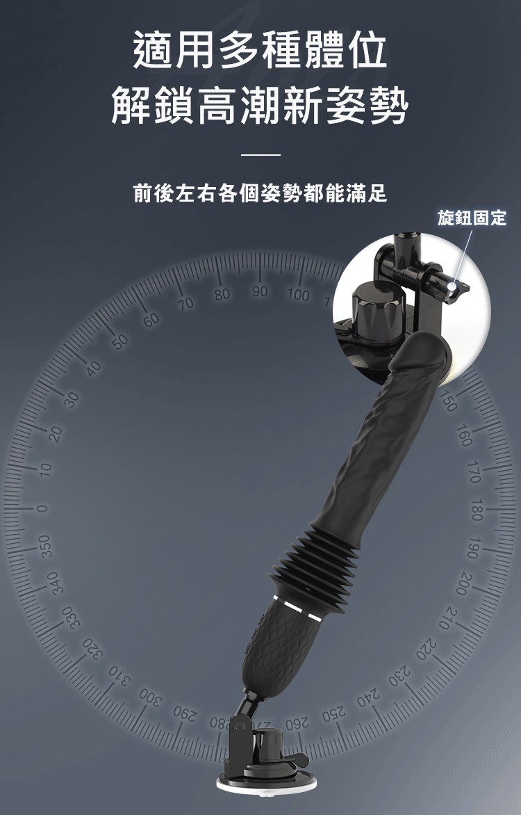 多體位適用設計,搭配旋鈕式固定與吸盤底座,不論是前後位、側躺、坐姿甚至站立,隨你怎麼玩,輕鬆駕馭快感。